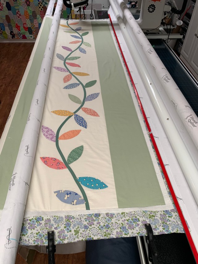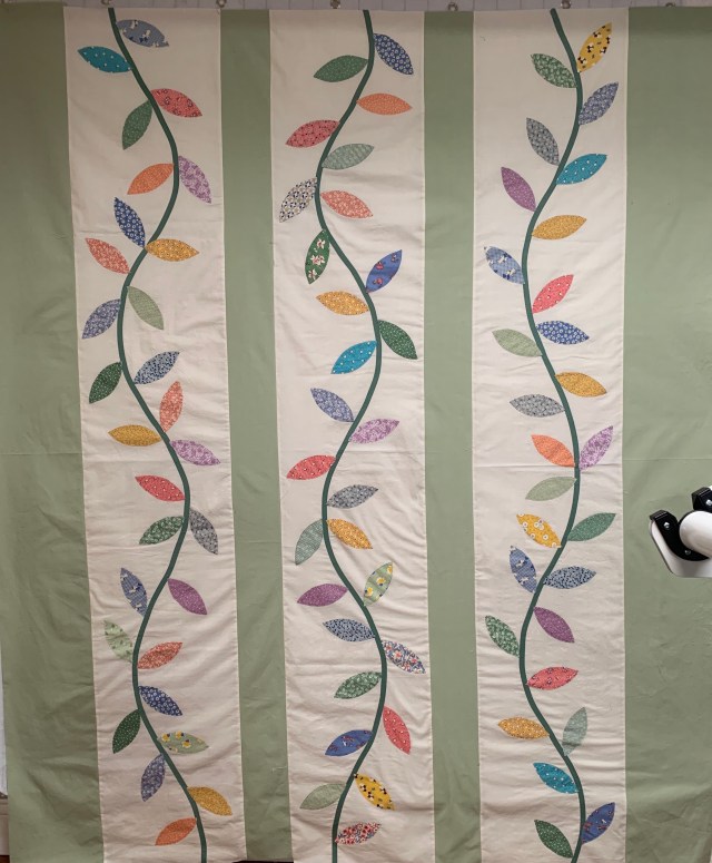 The green is so perfect (for more than one project as it turns out, right?) and the leaves are so fresh and charming, perfect for a strippy quilt! Will look forward to seeing the quilted finish!