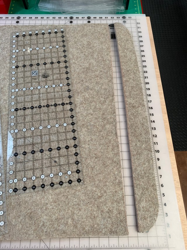 It was too thick to cut with my rotary cutter, but I did use it to “score” a line and then finished the job with my big batting scissors.