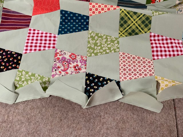 I really like your solution as the quilt seems “finished” now. Not only that but the added touch of green enhances the tumblers and I think I remember that you said you are adding a bit of green borders. Overall it seems to enhance the tumblers….so worth the extra work. Congratulations.