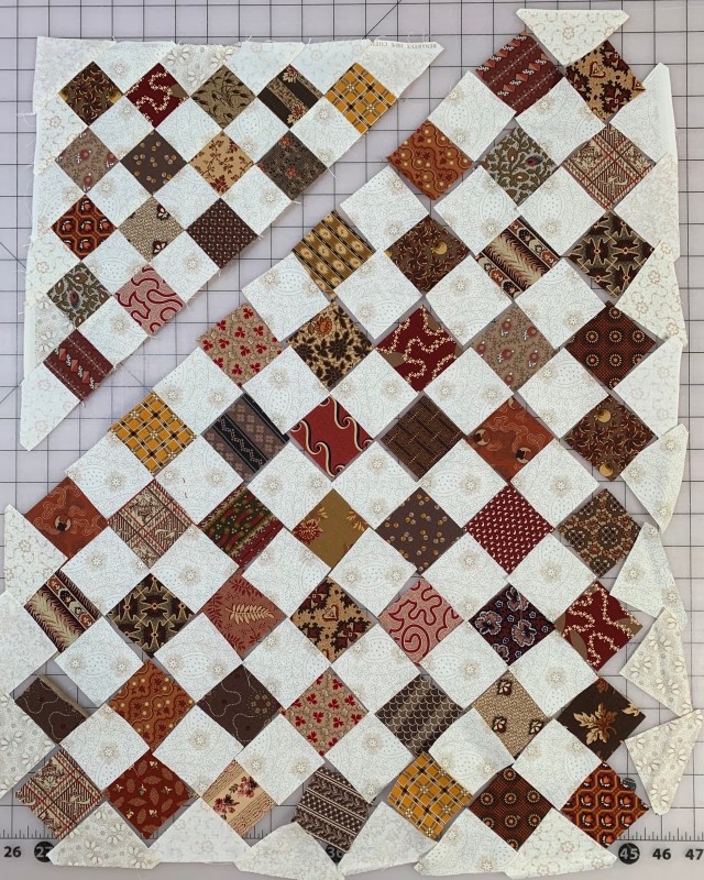 It’s always amazing how much smaller it looks when you start sewing! I think you can see that my setting triangles were oversized. I did that so I wouldn’t lose any points in the binding. It didn’t take long to baste.