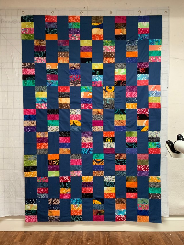 I’m always amazed at how quickly you go from start to finish on a quilt. I love the look of this one; that blue really makes the batiks pop!