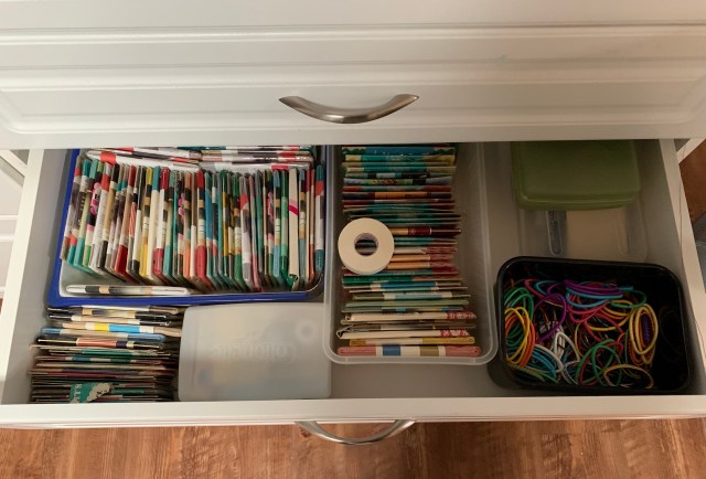 I decided to clean the walk in closet off the sewing room. I’ve been putting this off because one thing leads to another and another and another…… Actually, that’s how this drawer ended up looking like this. It is no where near the closet.
