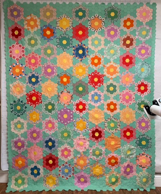 I thought I would hand quilt this right away. But it might need some closet time. I’m pretty tired of it. And I while I want to hand quilt this, I can’t bear the thought of quilting inside each of these tiny hexies. There HAS to be another way!