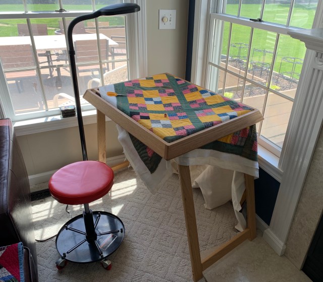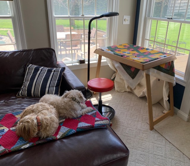 The quilting space is about 22 by 30 inches. Years ago, I hand quilted using hubby’s grandmother’s floor frame. Using this is a lot like that. I’ve placed it in the corner of my family room. I can turn it to watch TV or to look out the windows. The natural light is wonderful! When I’m not quilting, I close the shades to minimize fading.