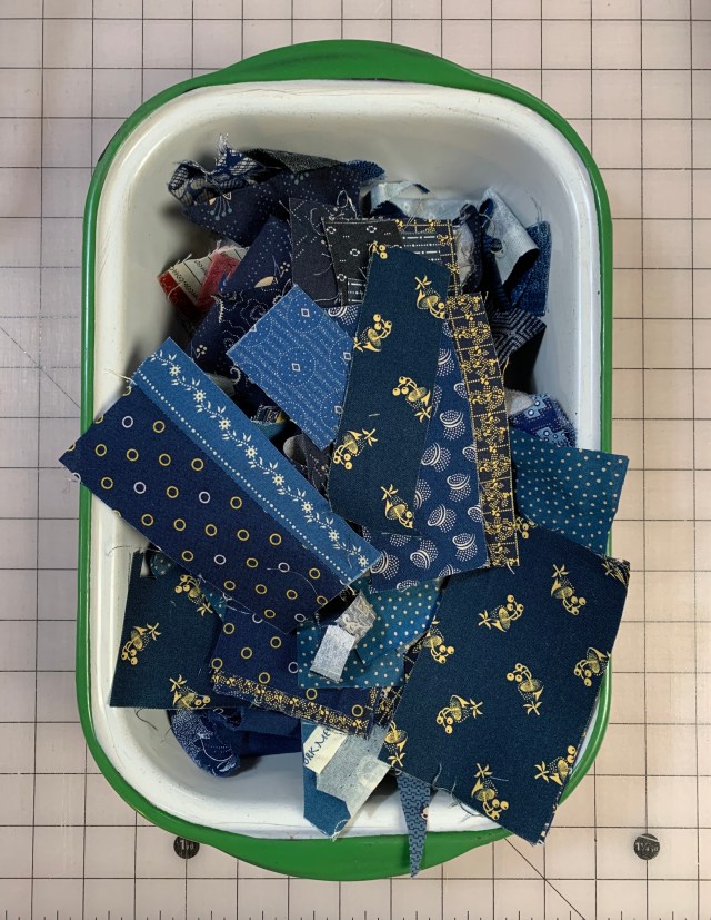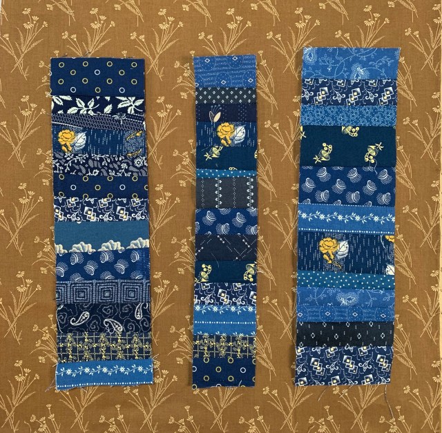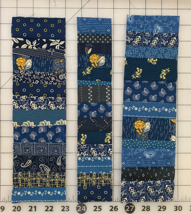 Barb at Fun with Barb has been making some lovely string quilts. I was quite taken with her Butterscotch and Blue and thought I’d dig through some scraps to make a mini version.