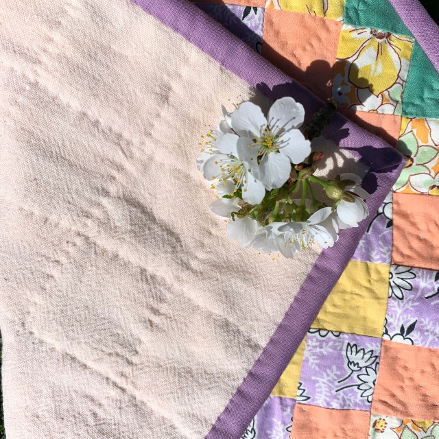 I found this pretty peachy pink feed sack for the back of both. My cherry trees were in bloom when I took these photos.
