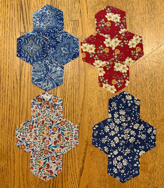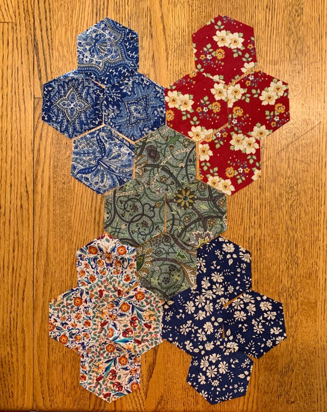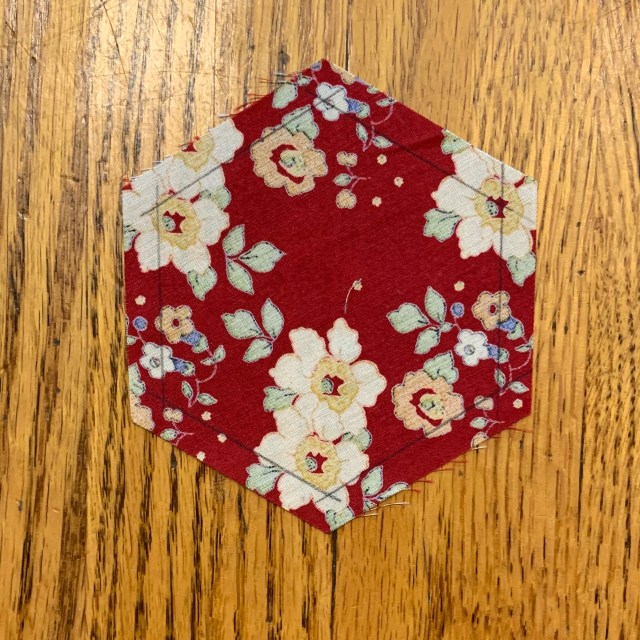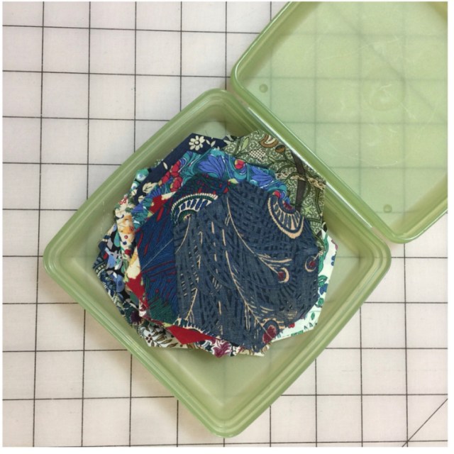 Since I’m traveling this month, I pulled out this UFO to work on. These hexies are cut from my small Liberty of London stash.