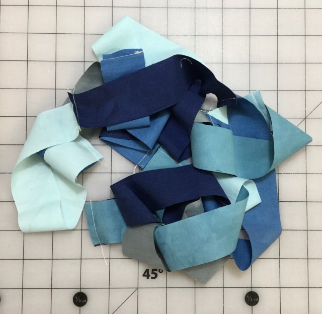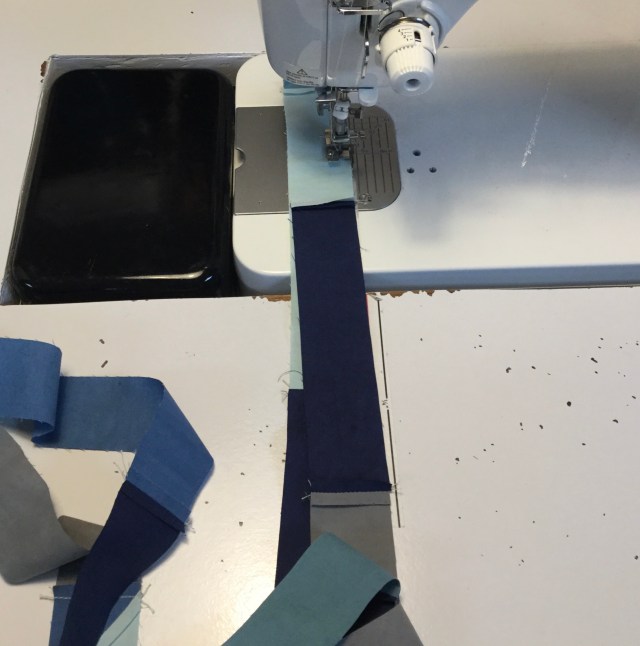 I finished my little triangle quilt and still had a few scraps left over. So I cut them into 1 1/2 inch strips and stitched them end to end.
