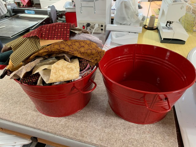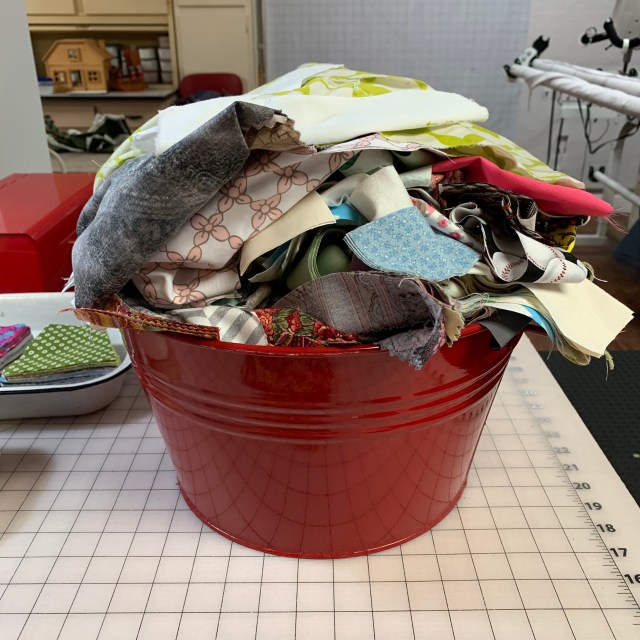 This is a loooonnnnggggg post! I decided had to do something with my overflowing scrap buckets. I keep buckets for modern and reproduction fabrics. Solids and QOV scraps are also kept separate. This first one is a baby bathtub! Before: