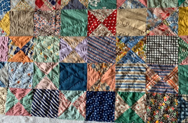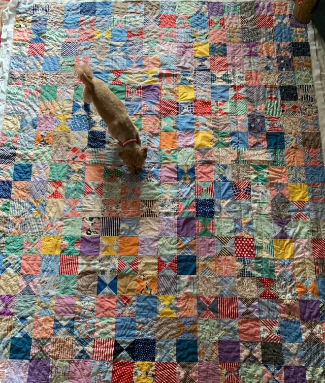 I’m still quilting this vintage 30s hour glass top. It’s hard to find a good place to photograph it in progress. I don’t know if you can tell, but I start around the outside when I quilt fans and work my way in to the center. This is contrary to most advice, but I find that when I baste well on the long arm, I don’t have any problems doing it this way.