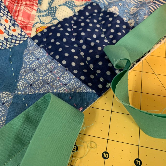 The mister and I had some traveling to do and I wanted to work on this. By adding the binding, I could trim up the edges and either quilt or hand stitch the binding while on the road.