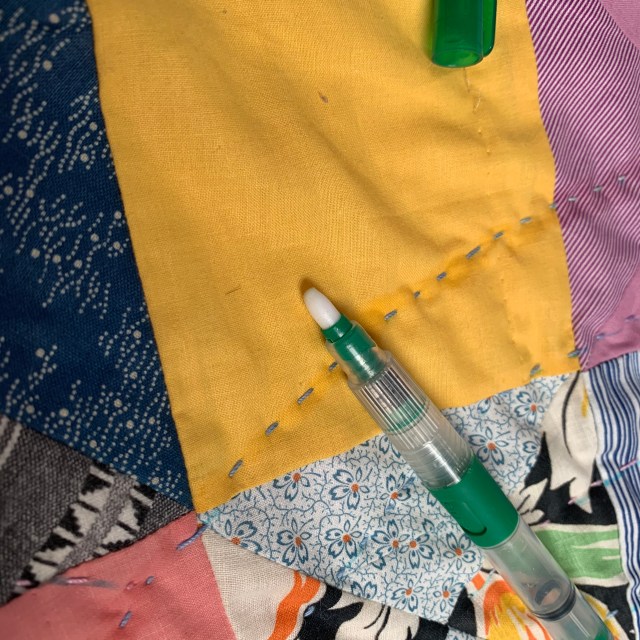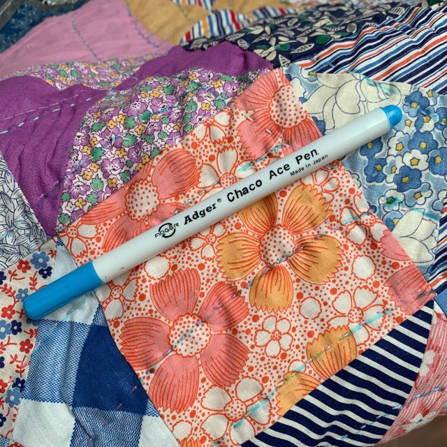 I had been using my Hera marker on this vintage top, but marking like that isn’t easy to do while traveling. So I went for the blue, figuring if it didn’t wash out, it wouldn’t show much either. I use this to remove marks as I go.