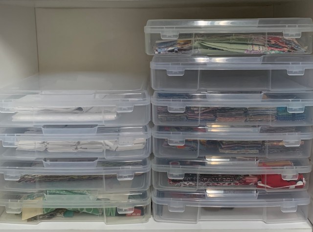 I really like these Iris bins from JoAnns. They are intended to hold 12 by 12 scrapbook paper. I like to use them for kitted up projects.