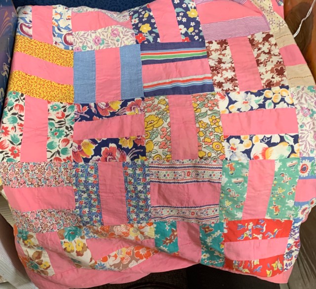 I’d have been tempted to grab the quilt third from the bottom. All the fabrics are fun, and I like the whacked off blocks by the border. 🙂