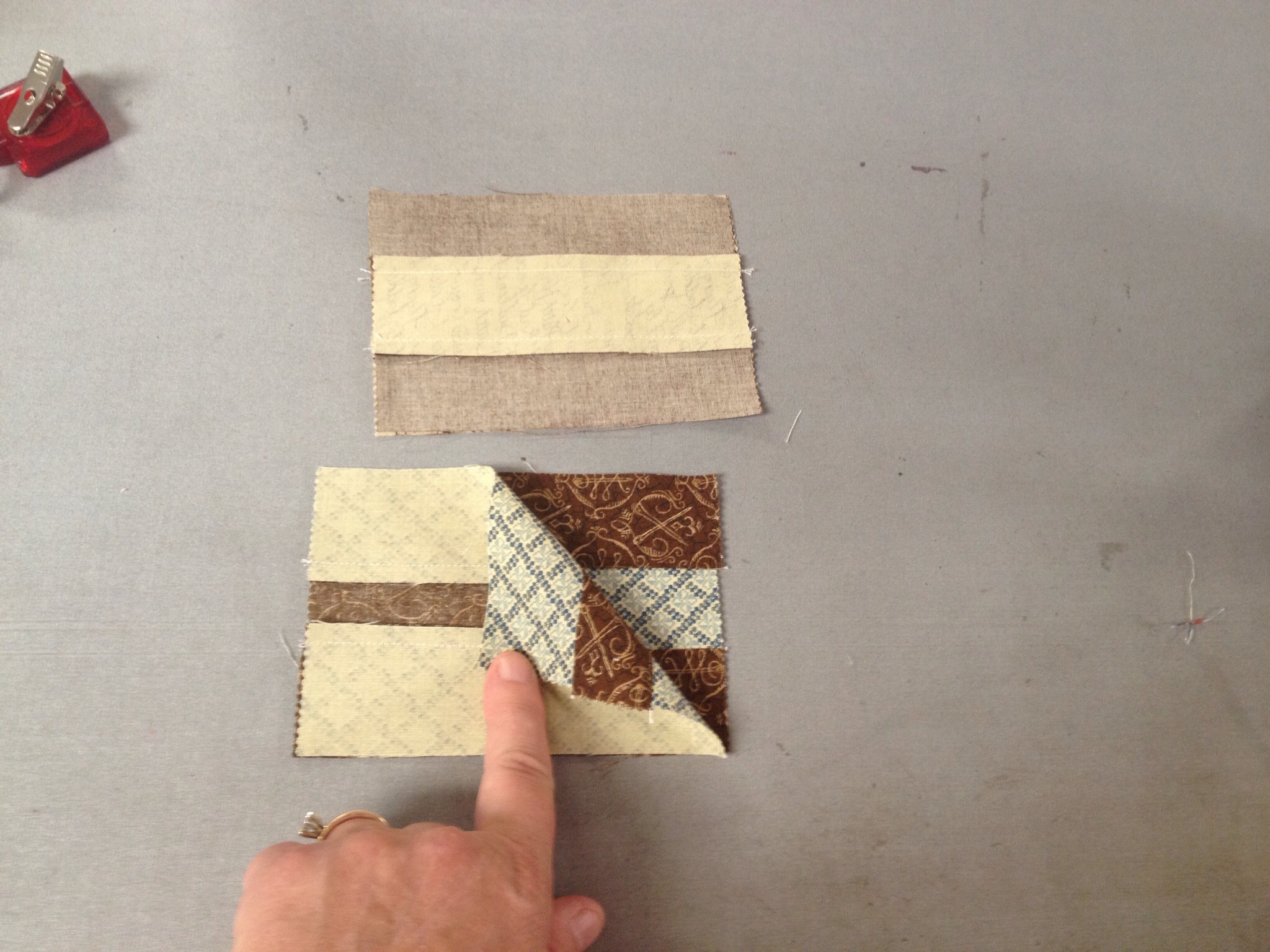 I always press to the dark side with these. Then I layer the two sets. Since I pressed to the dark fabric in each set, the seams automatically nest.