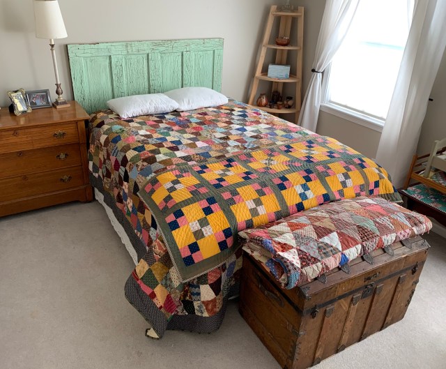 I used to use my guest room bed to layer all my quilts on. It prevented fold lines and I could do a “bed turning” for those who wanted to see my quilts. It was wonderful to have them all in one place, too.