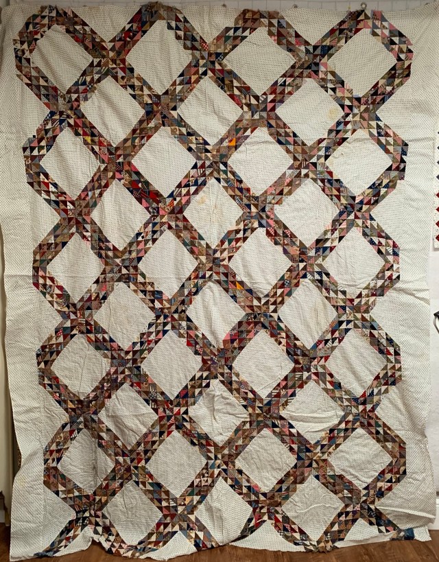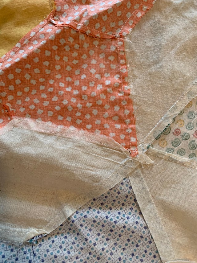 6. Sold Vintage Ocean Waves quilt top. The work in this top blows me away. Those are one inch finished HSTs. There is some age related staining as shown in photos. It has some fullness in the setting squares and borders. It is entirely hand pieced. $75 plus shipping.