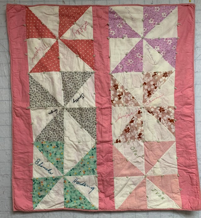 2. Sold Vintage Friendship Baby quilt. This little quilt is darling. I love the names embroidered on the blocks! It is in good shape. Tied. $20 plus shipping.