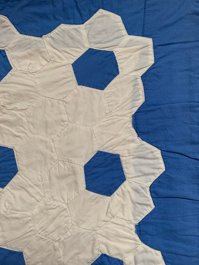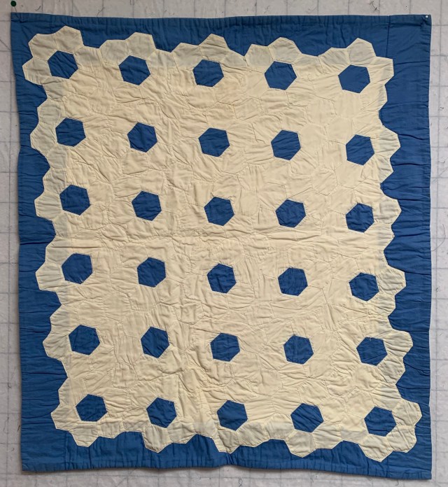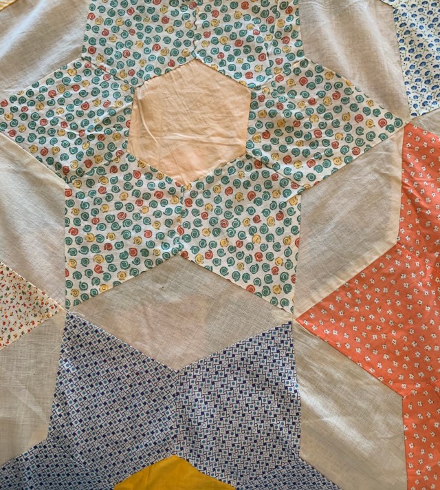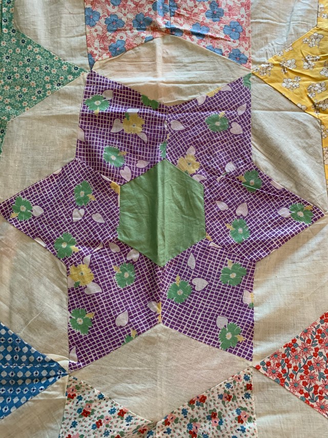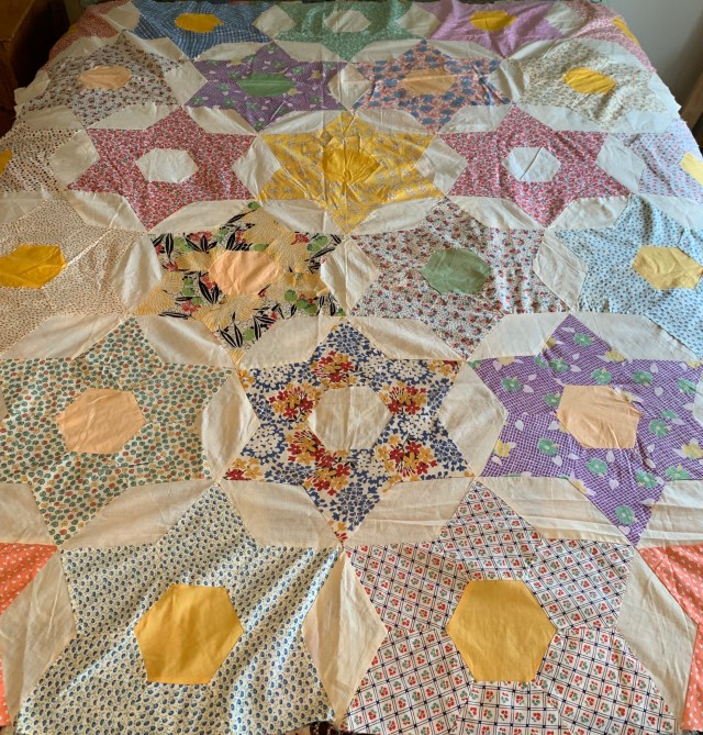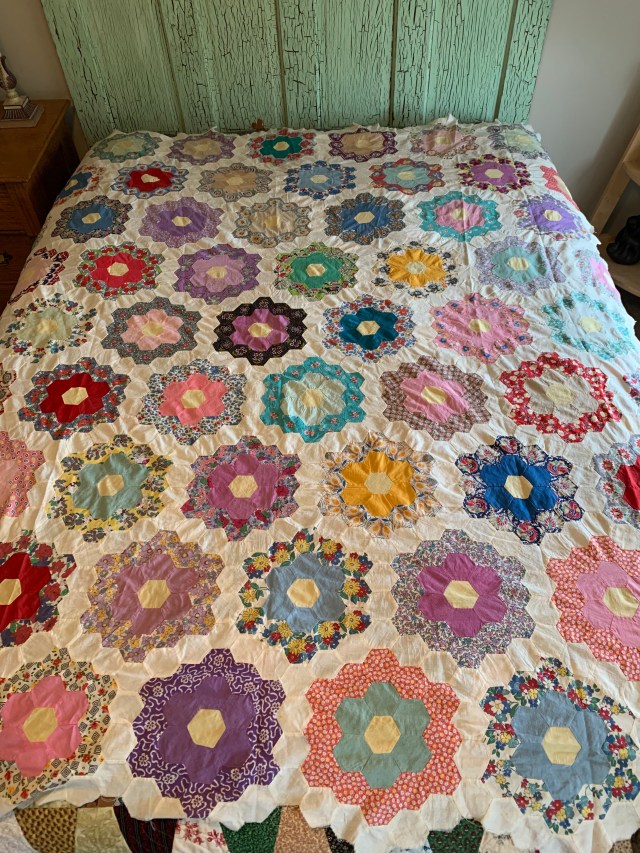 1. Sold First up is this vintage Grandmother’s Flower Garden top. It measures approximately 70 by 80 inches. I was sure it needed a few seam repairs, but I honestly can’t find them now. It has some great fussy cut blocks. Hand pieced. $50 plus shipping.