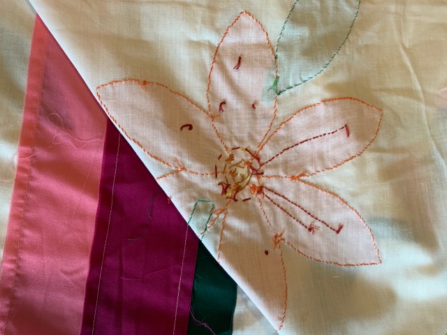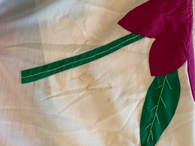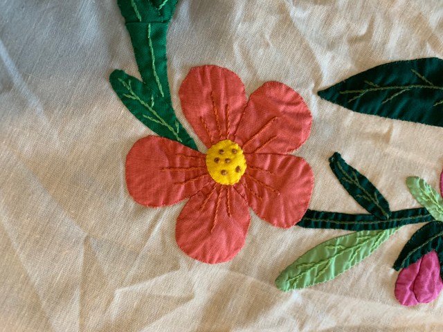 3. Appliquéd Quilt Top. This is huge! It measures 100 by 108 inches. It may have been a kit. The workmanship is beautiful. Background may be a poly cotton blend. There are a few marks and a tiny bit of fabric running. I have pics of this below. $45 plus shipping.