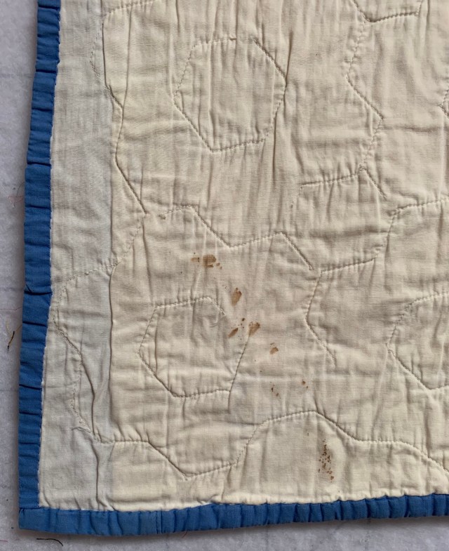 8. Small vintage hexie quilt. 28 by 30 inches. Machine quilted. Has discoloration one back and a couple rust stains as pictures. Otherwise good condition. $20 plus shipping.