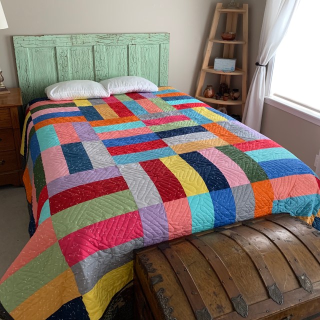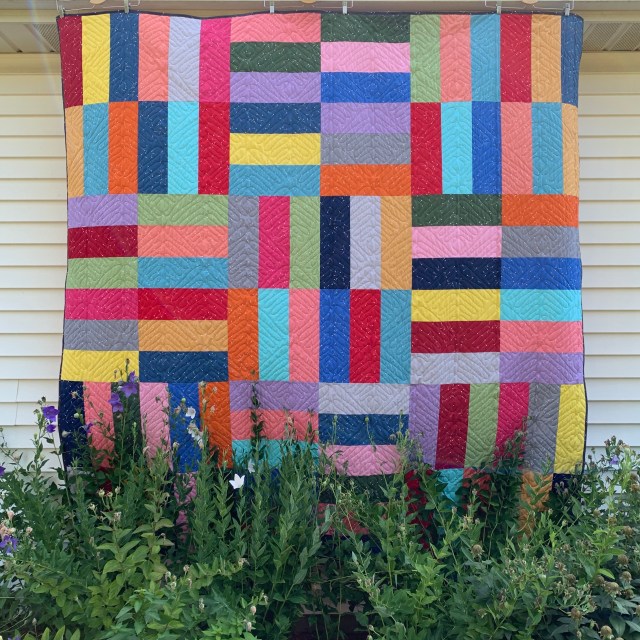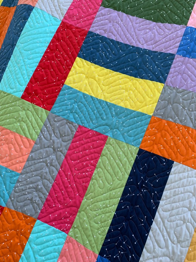 What an exuberant quilt! It’s all that color highlighted by being solids. I’m not a fan of solids, but this quilt might change my mind. Love the quilting pattern, too. Congrats, Katy!