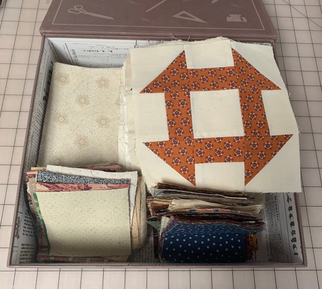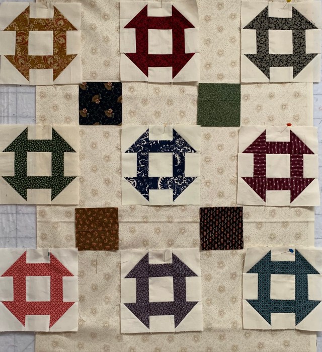 I finally decided on sashing fabric for my churn dash. Turns out, I didn’t have enough of either of my first two choices. So I pulled out these oldies from the Documentary line by Benartex. I think that came out back in the 90s!