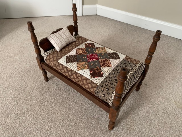 I love using scraps of vintage fabrics for little quilts like this. And I love how this little beauty fits on this vintage doll bed!