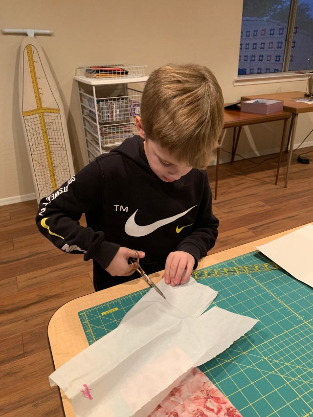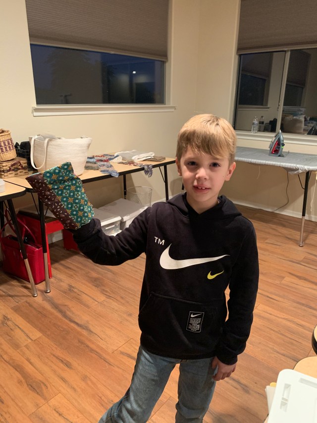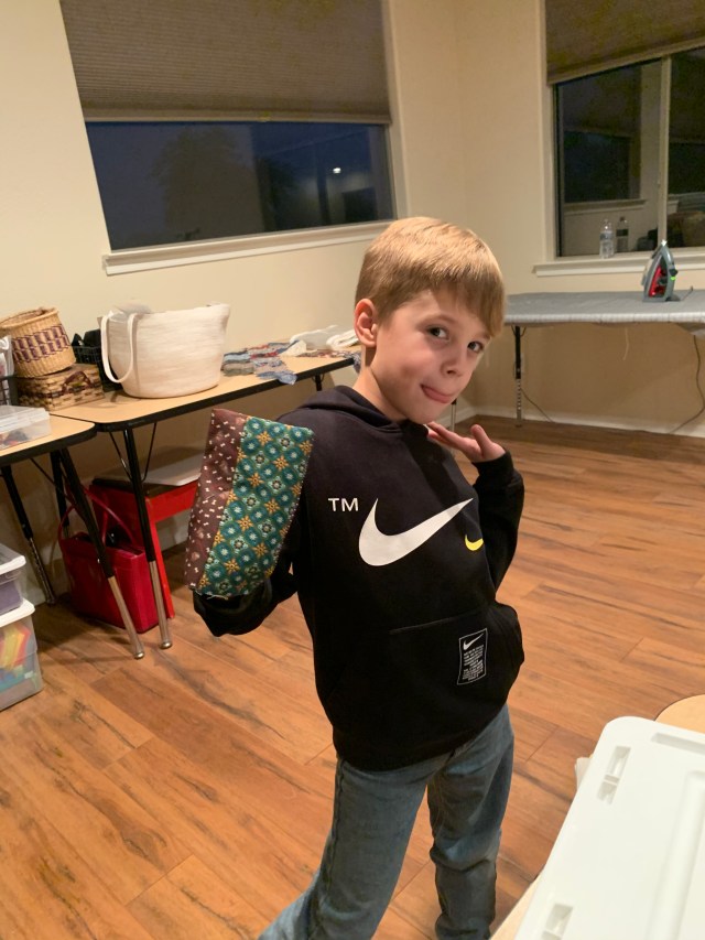 Oh, he’s so cute and getting soooo big!! Tell him we think he did a great job on both of his sewing projects.