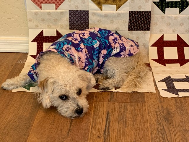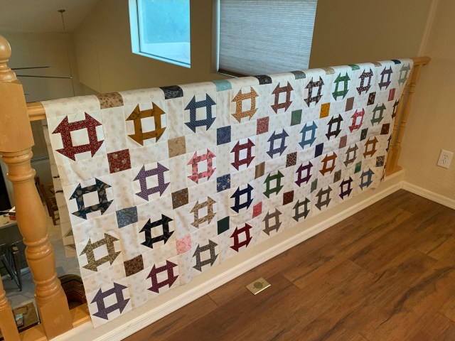 I have the blocks together with sashing. It currently measures about 60 by 87 inches. I had planned to add borders. I’m starting to wish I had made more blocks. I could do that, but I don’t have anymore sashing fabric with me. This is the border fabric.
