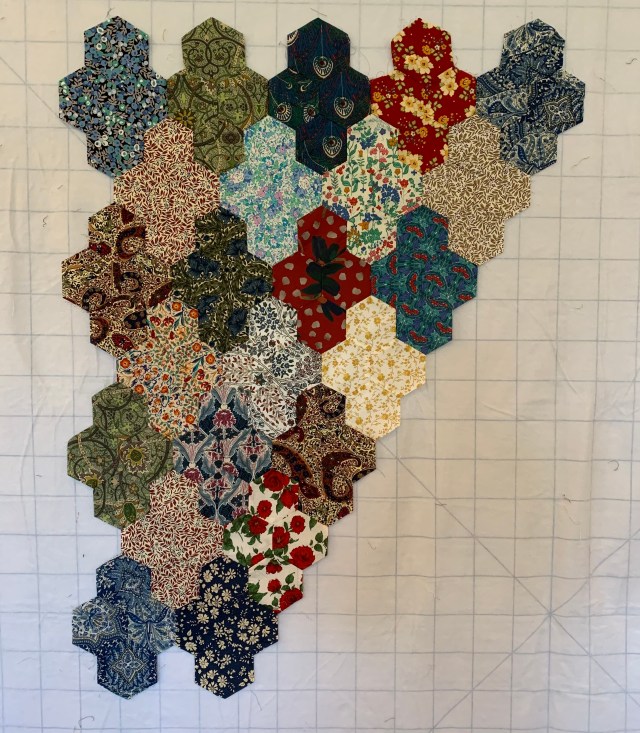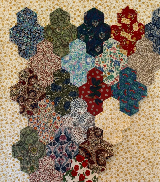 I think it needs to be a solid. I sure am glad I didn’t cut the Hexies already. I’m trying not to buy anything, but my stash here is limited so this will take some thinking.