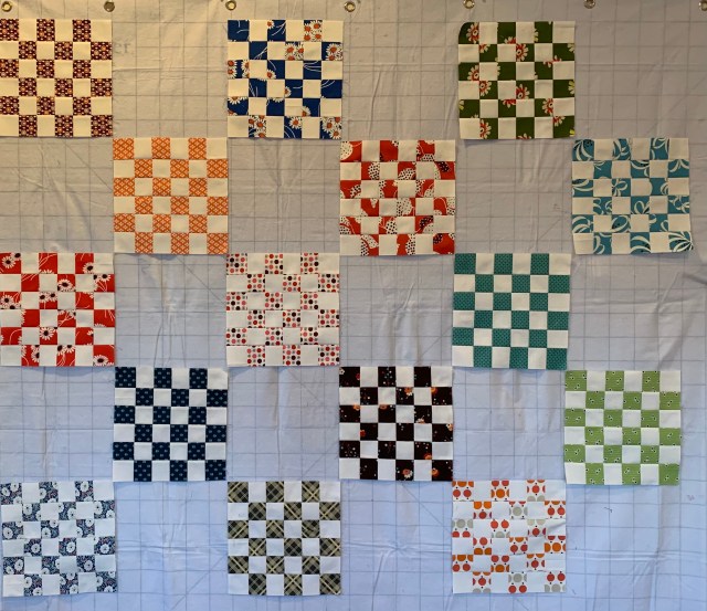 I’m thinking about putting solid squares in between the pieces blocks. Perhaps blue or yellow. I have pieces sitting ready so I can get going earlier tomorrow.