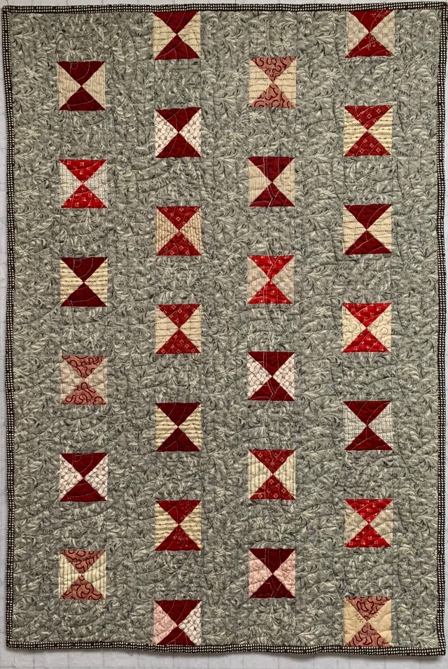 I used my small Baptist Fan pattern boards to quilt this on the long arm. I wanted the fans to switch direction somewhere near the middle. It’s an unpredictable plan and a bit tricky to boot.