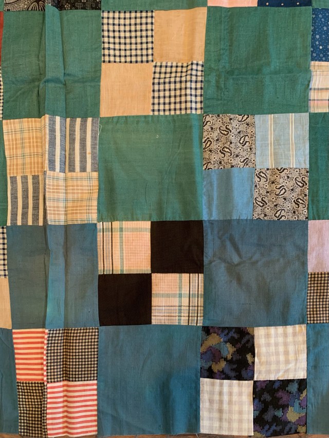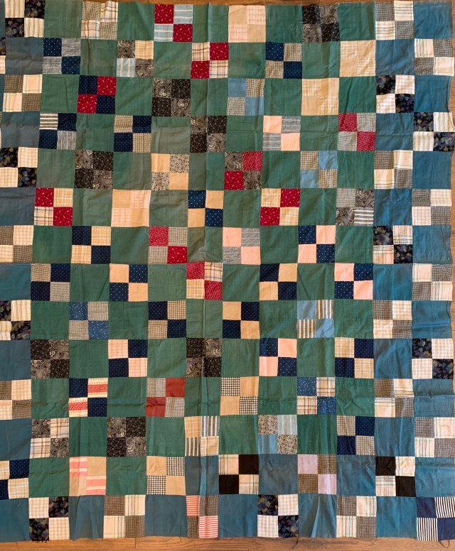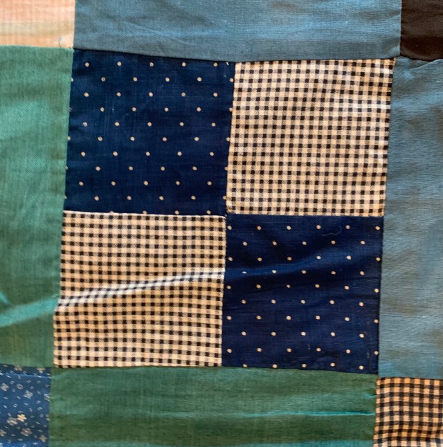 That is a great top! I love how the sides are more blue and the center more green. I’d love to know what the quilt maker was thinking while she pieced. Hugs,