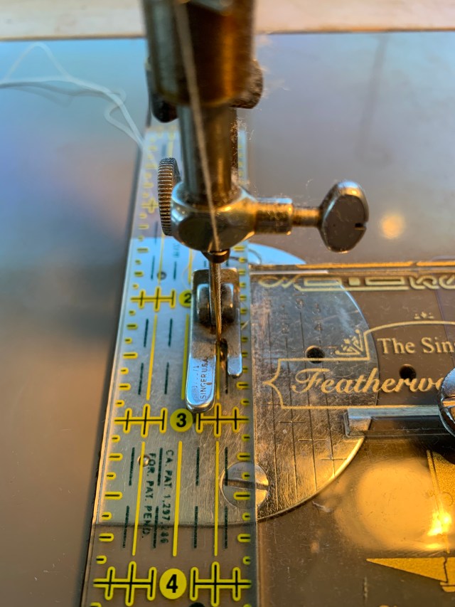 I love the seam guide shown here. It was a gift from a quilty friend. After your seam guide is set, lift the needle and presser foot and remove the gauge. Honestly, I usually use my little ruler and just drop my needle just to the right of the quarter inch line and use that for a gauge.