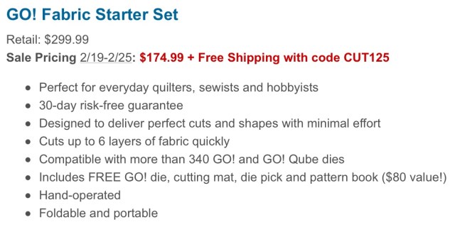 I just received a notice about the best deal since Black Friday! So of course I had to share with all of you. 😊 Especially since I’ve had a chance to try out my Accuquilt GO! Cutter and have found out how awesome it is. This set is on sale for the next week for only $174.99 with free shipping!