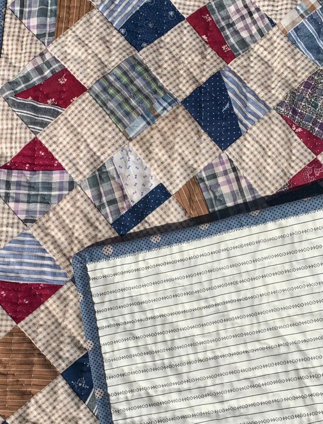 The top is all vintage fabrics. The backing is a Judie Rothermel print. The binding came from my neighbor.