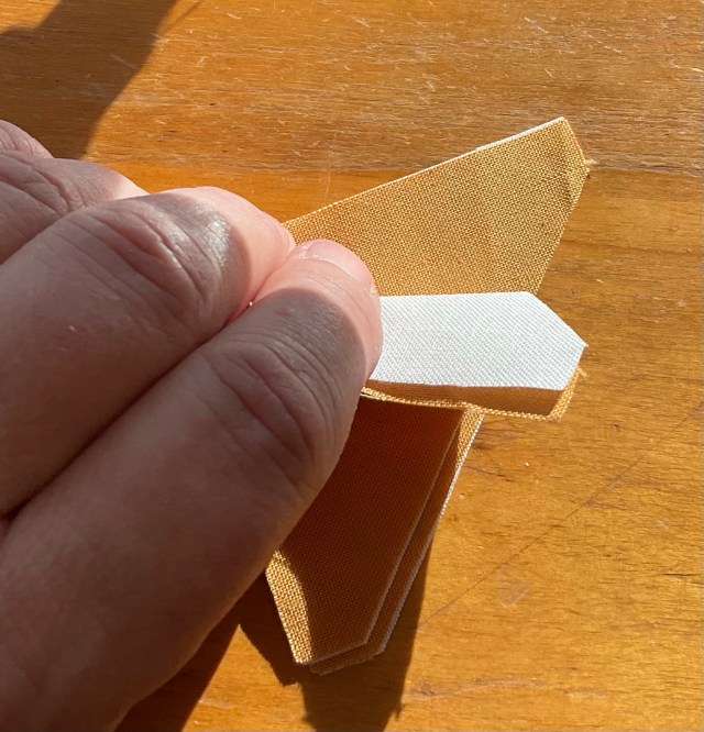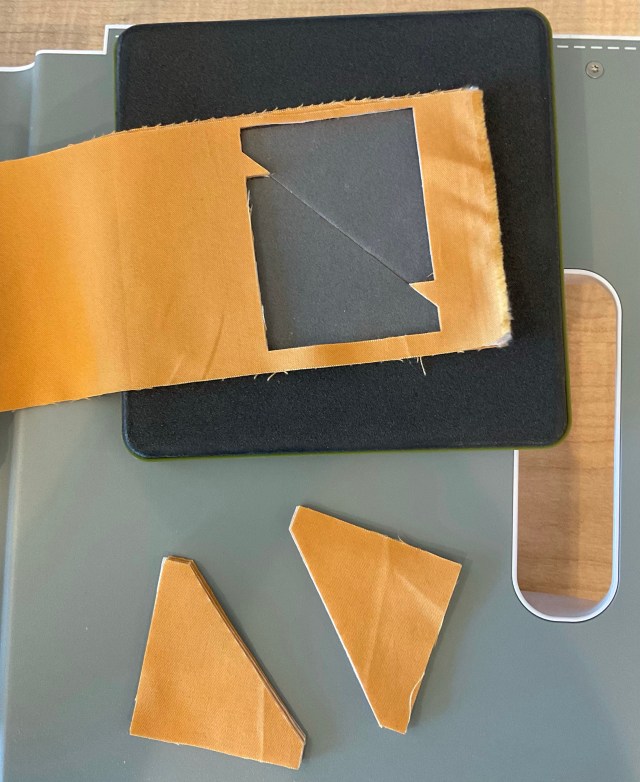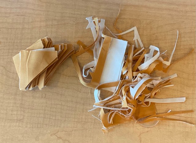 I’m making a lot of HSTs here. So I layered the Kona Snow and the butterscotch solid. I have no idea what that is.