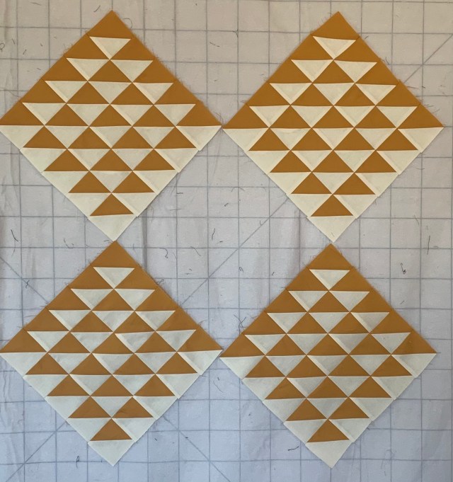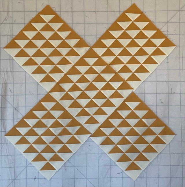 This ended up about 30 inches square. After its quilted, I’ll use the same orangey solid for the binding.
