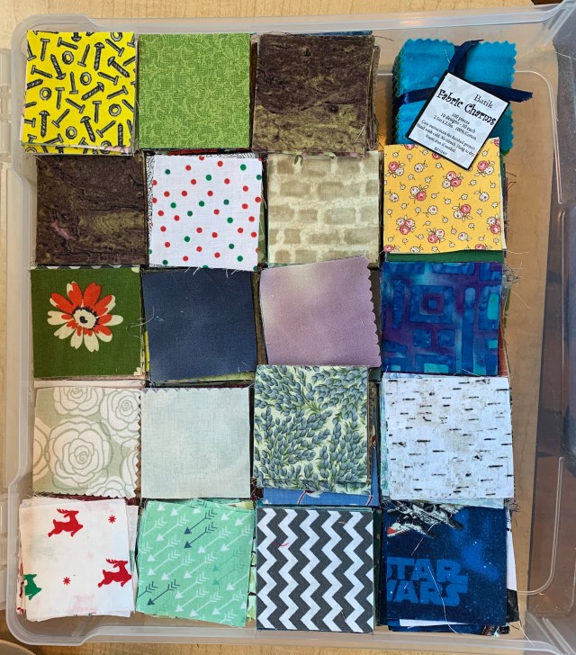 When I was working through my scraps last summer, I cut this entire bin of 2 1/2 inch squares. Each pile is about 2-3 inches deep.