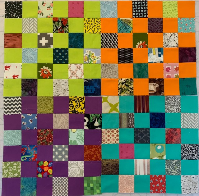 I’m making a similar block but working with 2 1/2 inch strips instead. Four 10 inch strips sewn together and then cut into four strips (of four 2 1/2 inch squares). Alternate the top and bottom of the four strips, sew them together and you have a great 16 patch. Same look, just a different process.