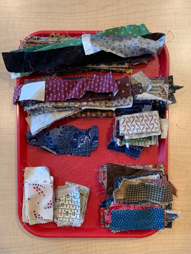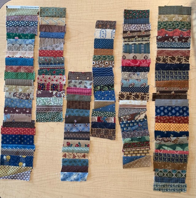 I brought a bag of little scrappy strips out here with me last fall. I sorted them roughly by length.