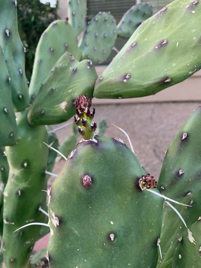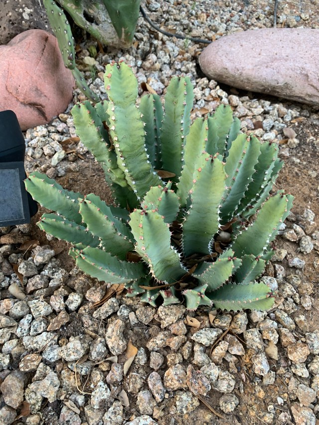 This planter in front of our house was put in by the first homeowner and it was supposed to be a fountain, but the HOA nixed that idea. So it became a planter. That big prickly pear was shriveled and dying when we arrived. But look at it now! It’s even getting new pads! I did a lot of trimming on this.