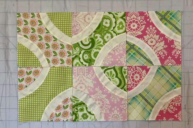 Pinning is good for this. Also, I found when doing these curvy pieces that stabilizing the fabrics before cutting with either light sizing or Best Press seems to help me. Always pin from middle to each end and everything seems to ease in for me. Don’t give up on this…it is going to be beautiful when finished!