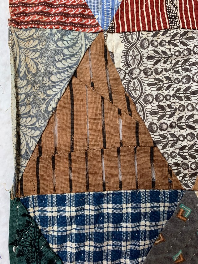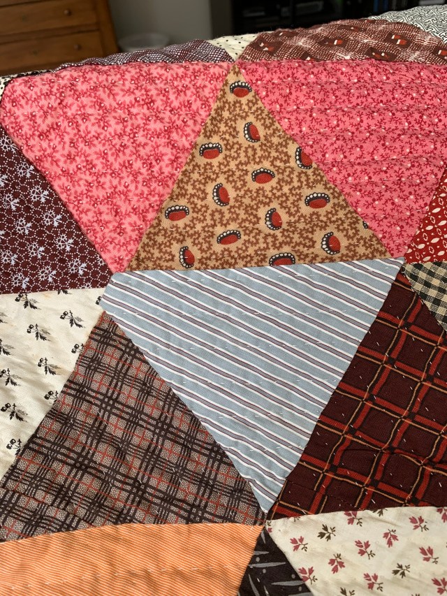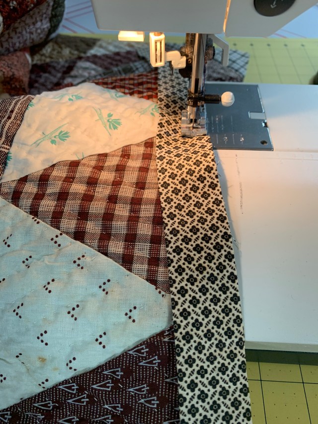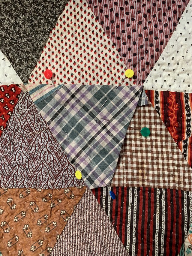 I’m getting to the end of this project! I didn’t have vintage stash with me in Arizona so as I came across pieces that needed replacing, I just skipped quilting them and moved on. Pieces like this.