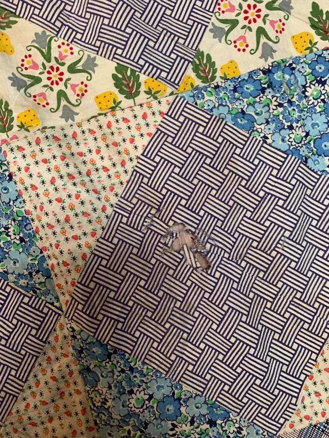 All of them are great options! On the “Mouse Lunch” quilt, maybe she paper-pieced it and didn’t trim the seam allowances. Any chance of finding a seam allowance large enough to patch the holes?
