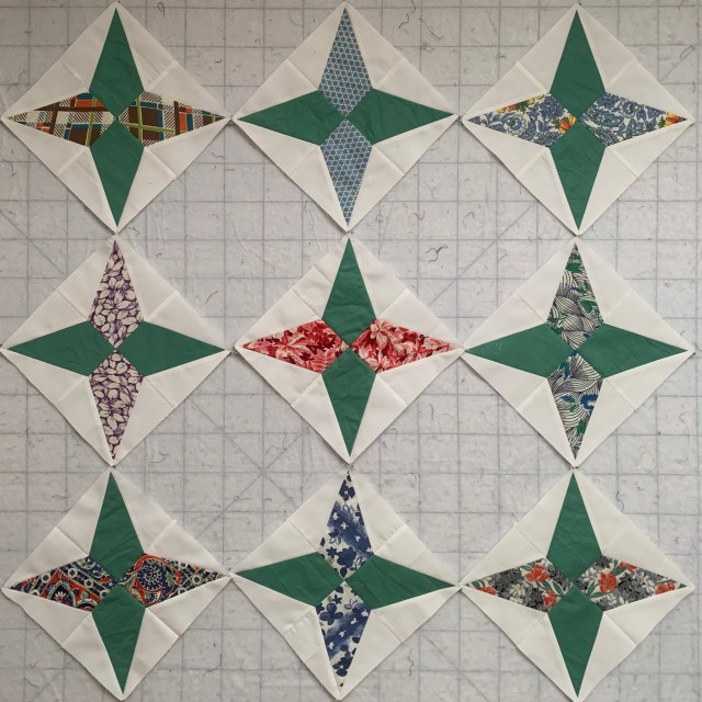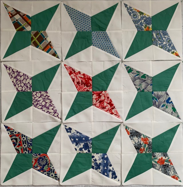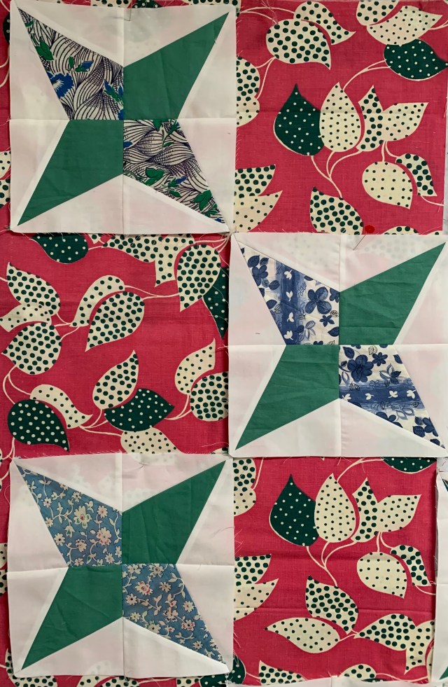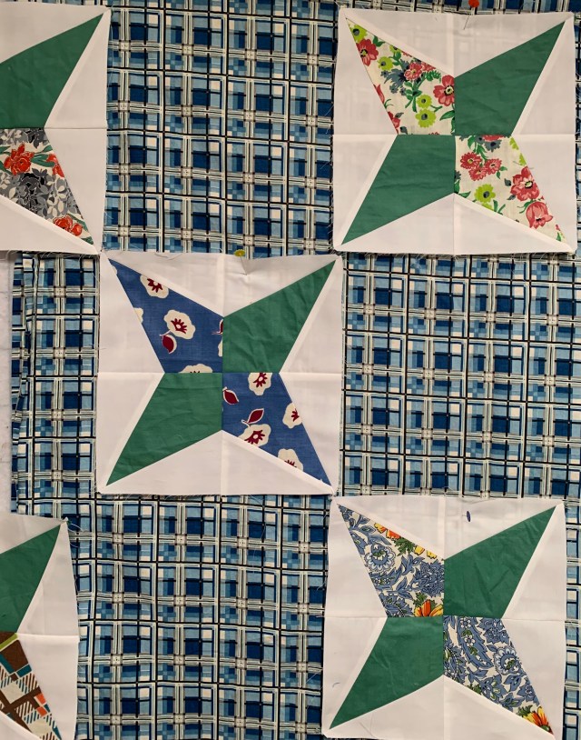 I think I like the alternate block setting best. But I need to find a good fabric for those blocks. These two options are both from my vintage stash.