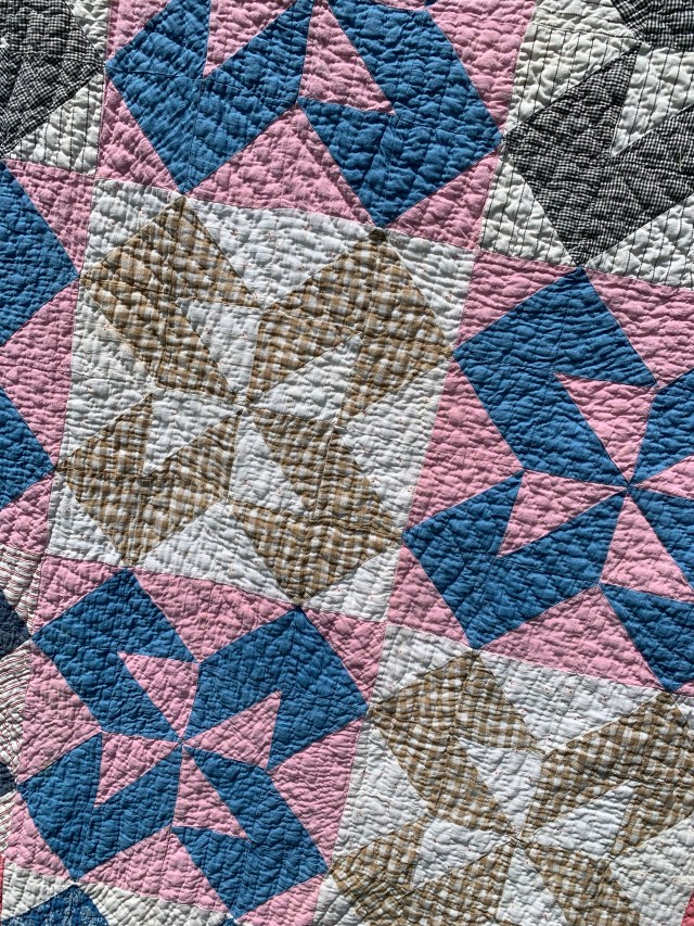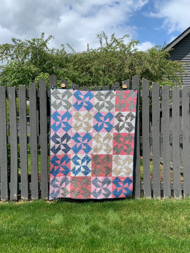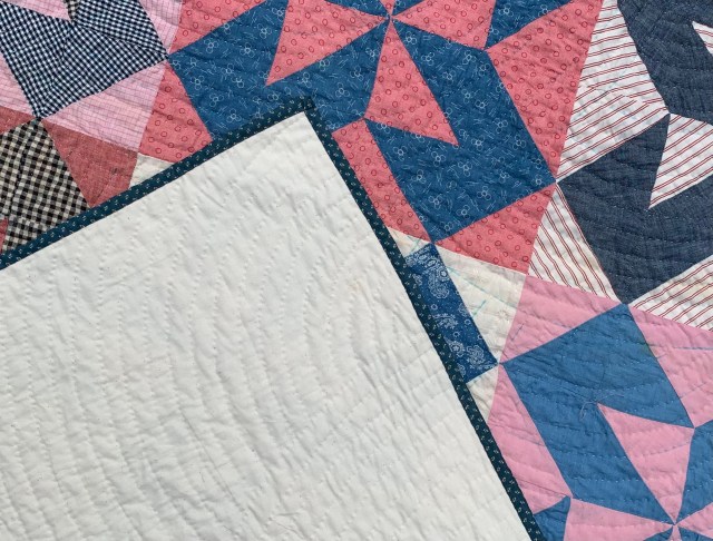 What a fantastic quilt! This is such a dynamic pattern, just with half square triangles, so creative and graphic. What a great accomplishment to have hand quilted it. The texture is great. I love that you used muslin backing – very vintage feeling. Congratulations on a beautiful finish.