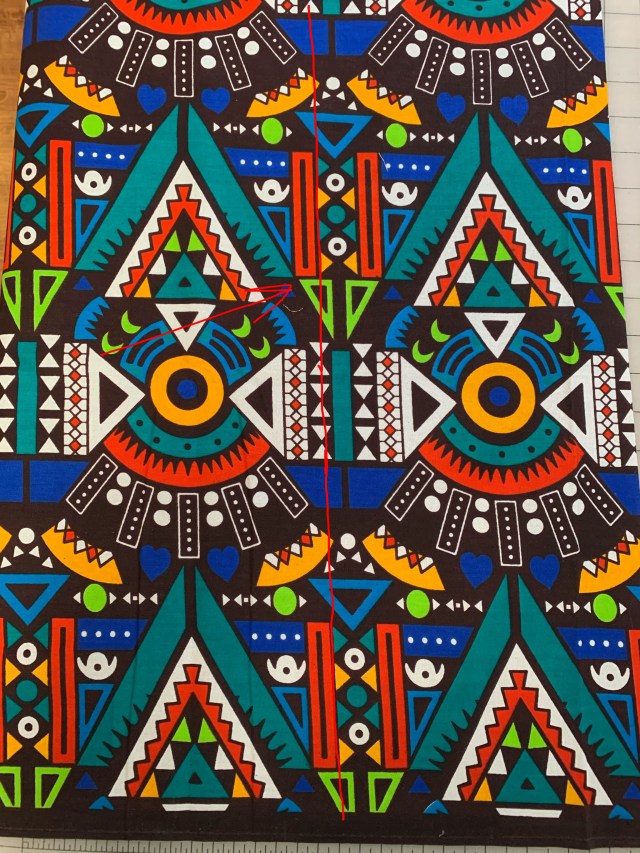 It wasn’t printed completely straight, not uncommon with any fabric, but more noticeable on larger prints. I picked a line in the design and cut eight strips of one pattern repeat each. Can you see the red line in the photo below? That shows you where I cut my strips. I used my rotary cutter and ruler and went from the edge of one rectangle to the next.