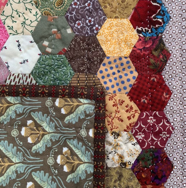 I still have a few leftover basted hexies , but I’m putting them away for now. I love this fabric on the back.